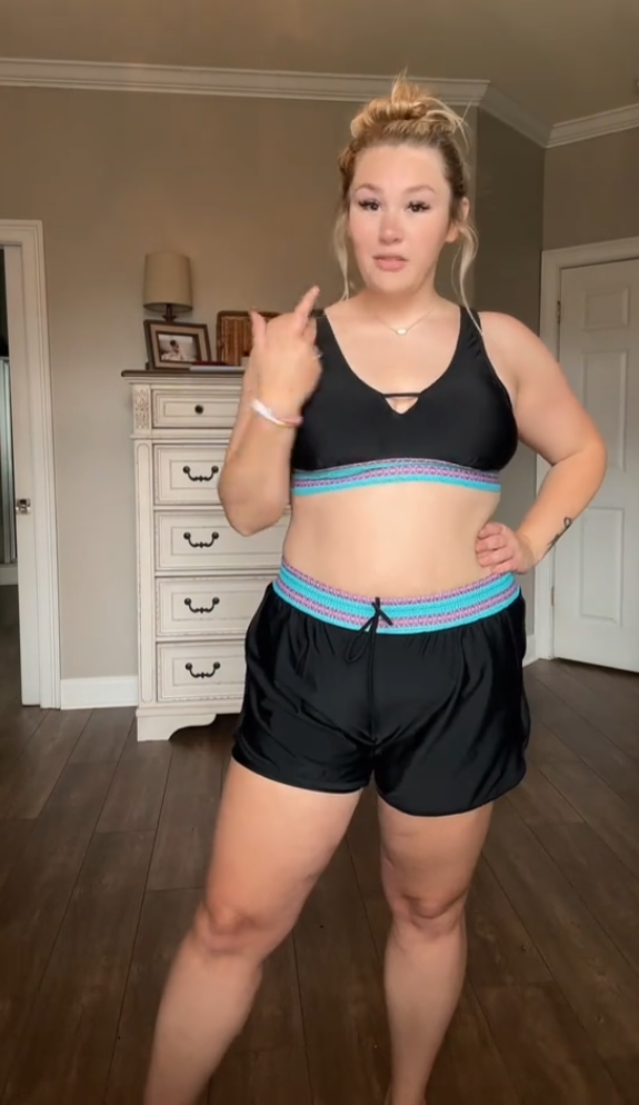 Trendy bikini featuring a V-neckline and wide shoulder straps for added comfort and support. Bold black and green color blocking creates a striking contrast, enhancing the overall look. High-waisted shorts come with an elastic waistband for a secure fit and include pockets for practicality. Perfect for beach days or poolside fun, combining style and functionality effortlessly.